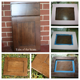 Here are the steps I took: 1. Someone gave me several cabinet doors so all I did was remove the door. 2. I took it outside to sand. 3. You can see a small hole in the door where a handle was supposed to go. I was going to buy some hole filler but didn't want to spend the extra money so I'll show you below how I covered up that hole. 4. All sanded and taped, ready to paint. 5. I used some flat light pink paint that I received for free. 6. All painted (I did 2 coats) and ready to paint the middle with chalkboard paint. I forgot to take a picture of this step but I just followed the instructions on the chalkboard paint bottle and did two coats.